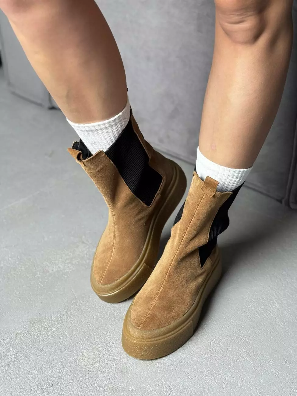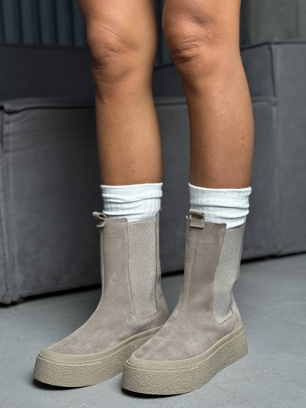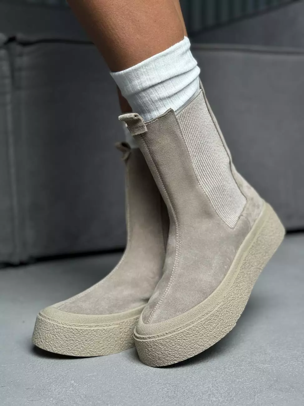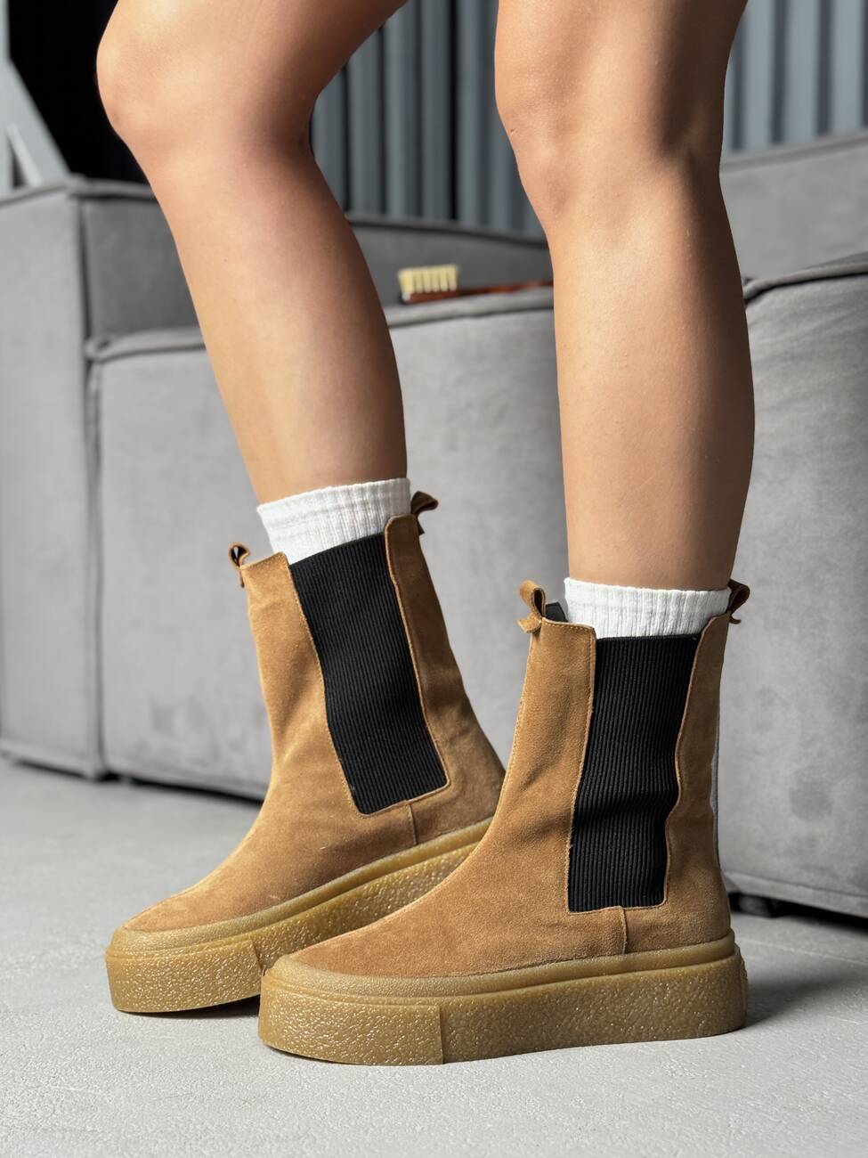 Висока підошва додає сучасного вигляду та захищає від вологи, а м’яка замша створює відчуття комфорту та затишку.