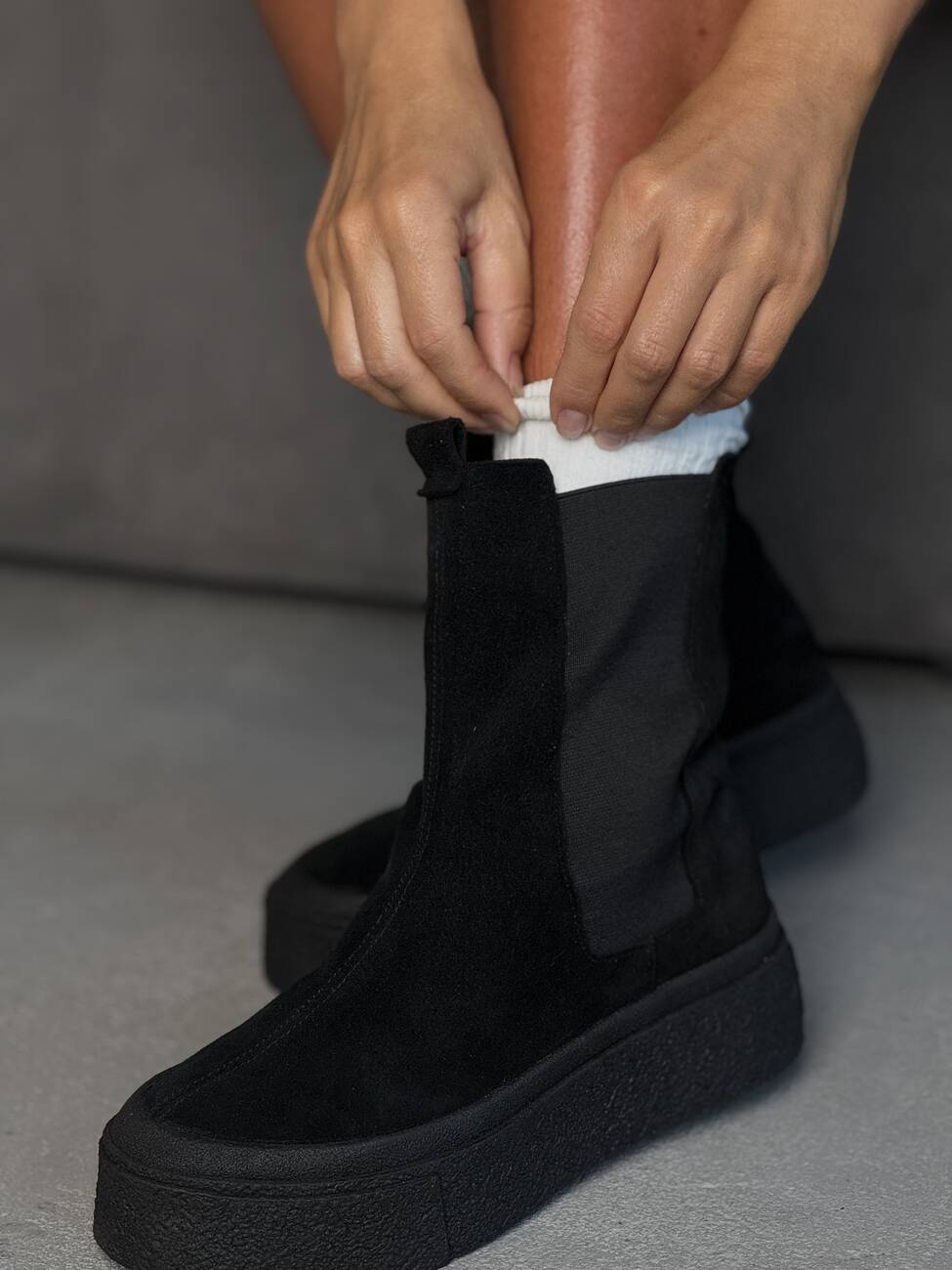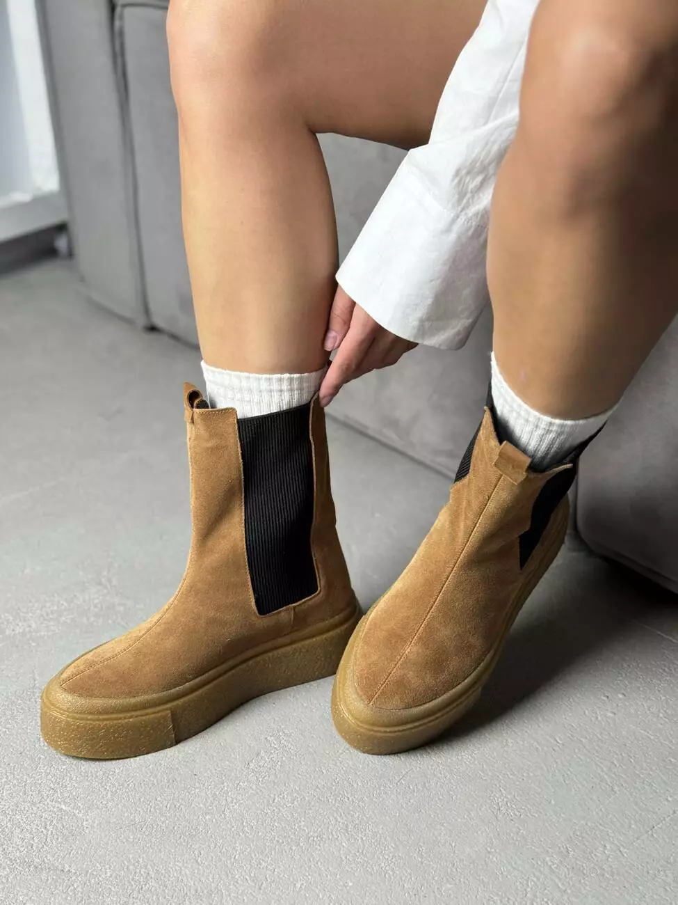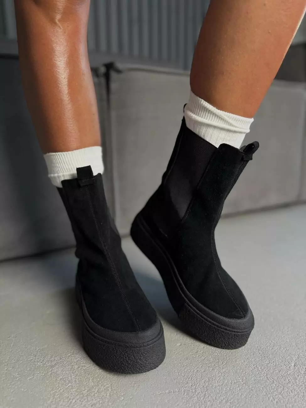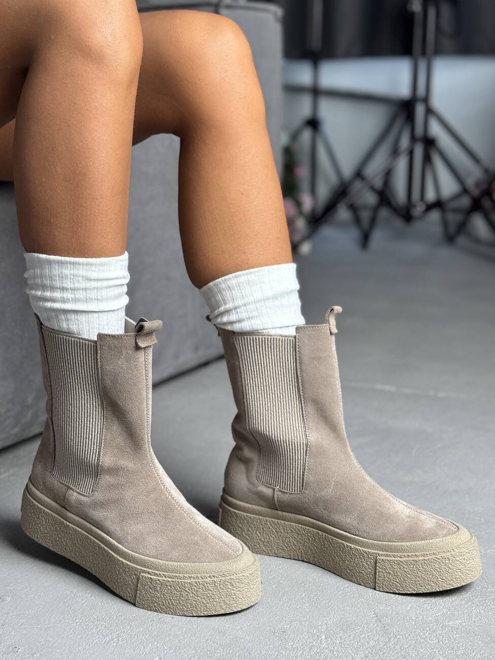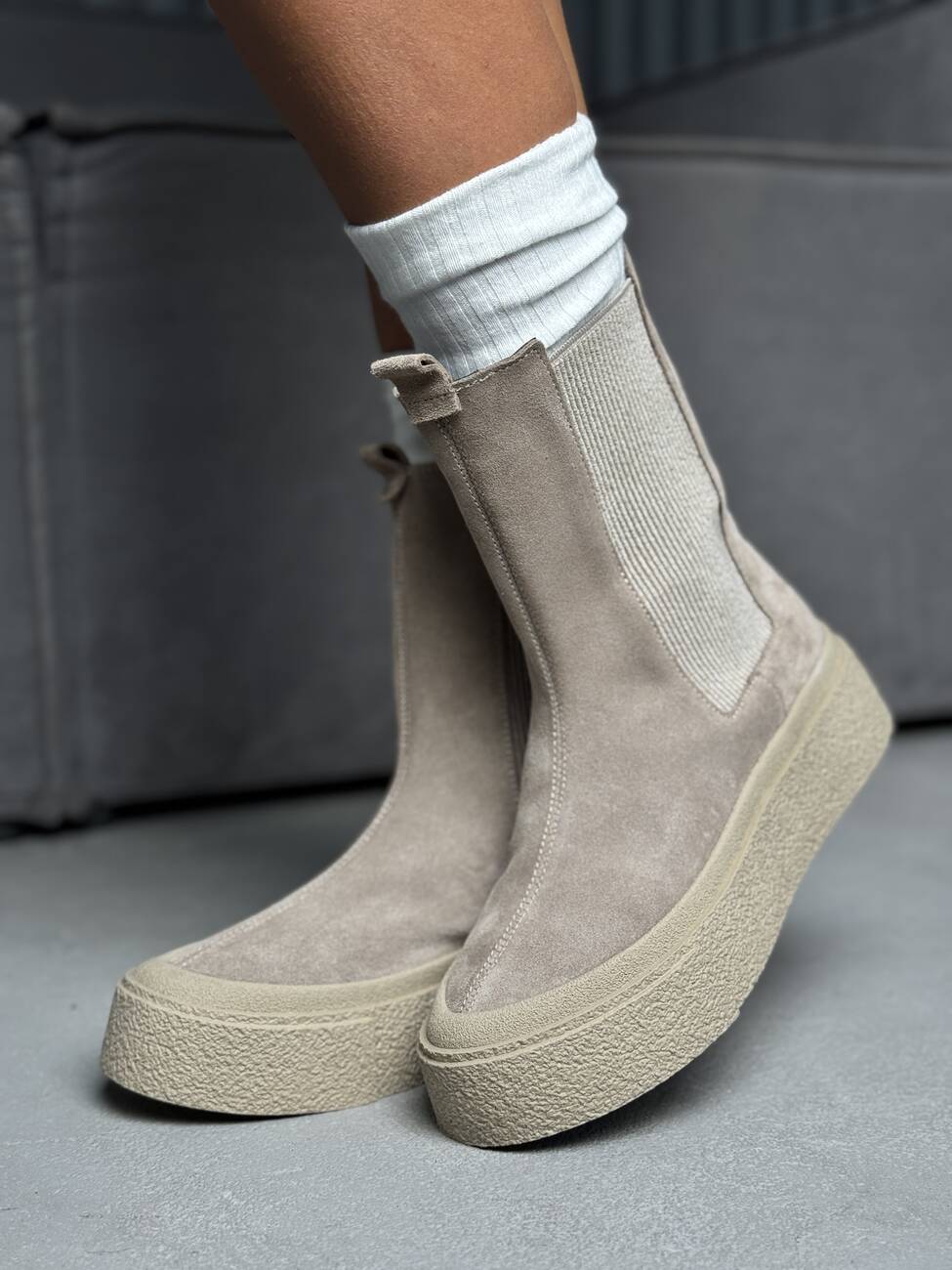 Висока підошва додає сучасного вигляду та захищає від вологи, а м’яка замша створює відчуття комфорту та затишку.